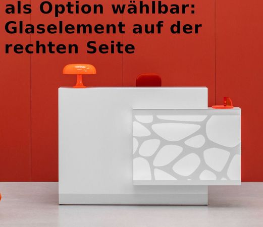 RGBW LED: Beleuchtung, Fernsteuerung ein Kabeldurchlass in der Arbeitsplatte bis zu 0,5 cm höhenverstellbar zum Ausgleich von Bodenunebenheiten Empfangstheke kann auch zum spiegelverkehrten Aufbau geliefert werden (Auswahlmöglichkeit siehe oben) |