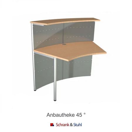Hinter der Thekenfront befindet sich ein vollwertiger Arbeitsplatz. Die Arbeitsplatte ist 65 cm tief und 72 cm hoch. Die Platten sind melaminharzbeschichtet und mit ABS-Kanten versehen. Des Weiteren besitzt jede Arbeitsplatte eine Kabeldurchlassdose.