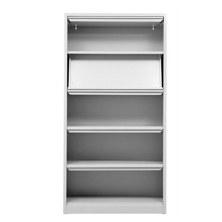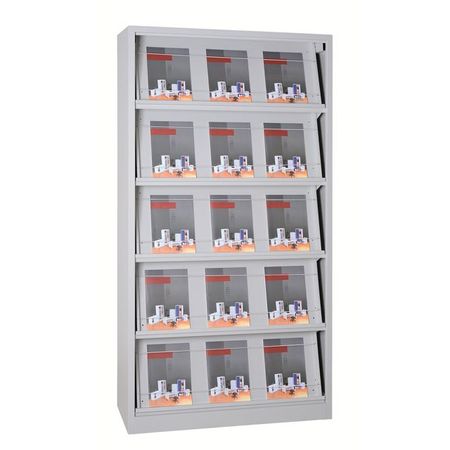 | Produkt | Prospektschrank | Prospektregal aus Stahl 195x100x42 in lichtgrau mit 5 klappbaren Prospektböden |