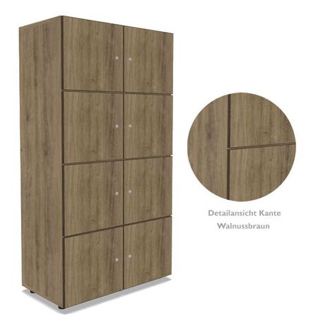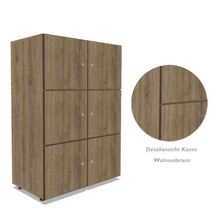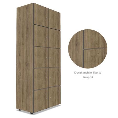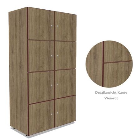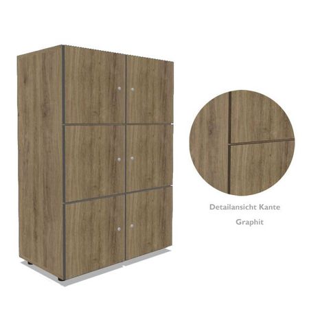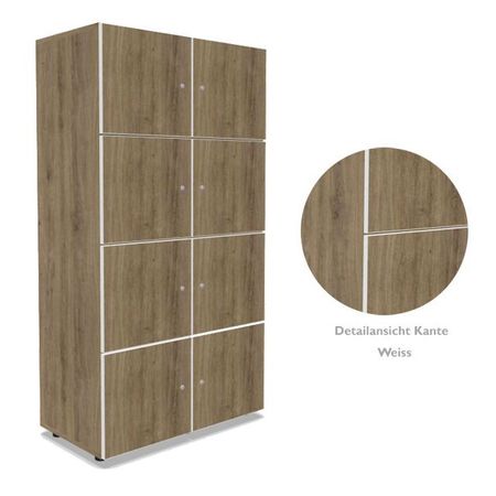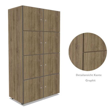 | Besonderheiten | alle Türen mit Soft-Close Scharnieren zur geräuscharmen Nutzung - mit wählbarer Öffnungsrichtung auf Wunsch mit elektronischem RFID-Schloss zur Öffnung mit elektronischer Karte oder mit Zahlenschloss Sichtrückwand, beidseitig mit Melaminharz beschichtet, geeignet zur freistehenden Nutzung z.B.: als Raumteiler |