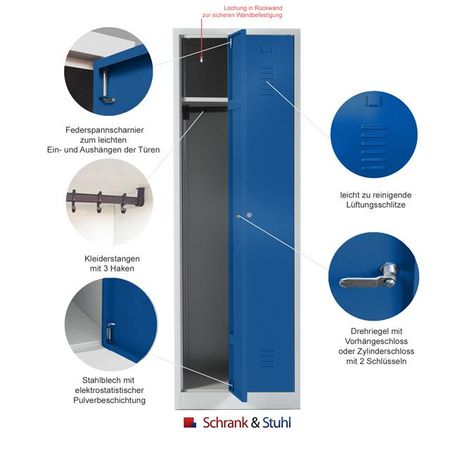 Vorrichtung zur sicheren Wandbefestigung an der Rückwand des Metallspinds vorhanden Hutboden und Kleiderstange mit 3 verschiebbaren Kleiderhaken, pro Abteil | herausnehmbar leicht zu reinigende Belüftungsschlitze gestanzte Etikettenrahmen für Namensschilder Garantie: 3 Jahre Herstellergarantie |