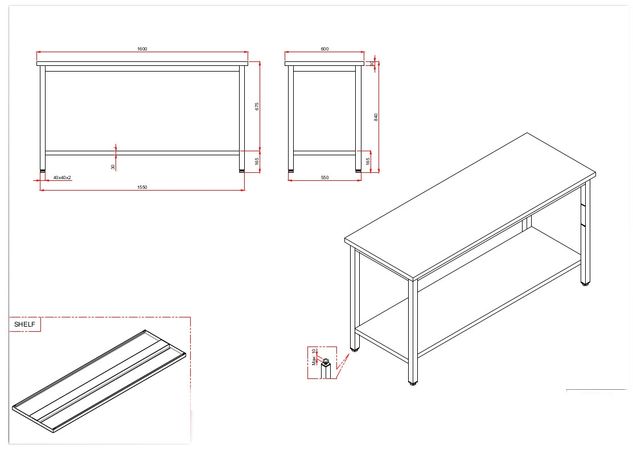 Außenmaß Werkbank gesamt: 84 x 160 x 60 cm (HxBxT) 2 Schubladenblöcke: 1 x 2 Schubladen und 1x 3 Schubladen Außenmaß der Schubladenblöcke jeweils 38 x 46 x 55 cm (HxBxT) Füße: Quadratstahlrohr 4 x 4 cm |